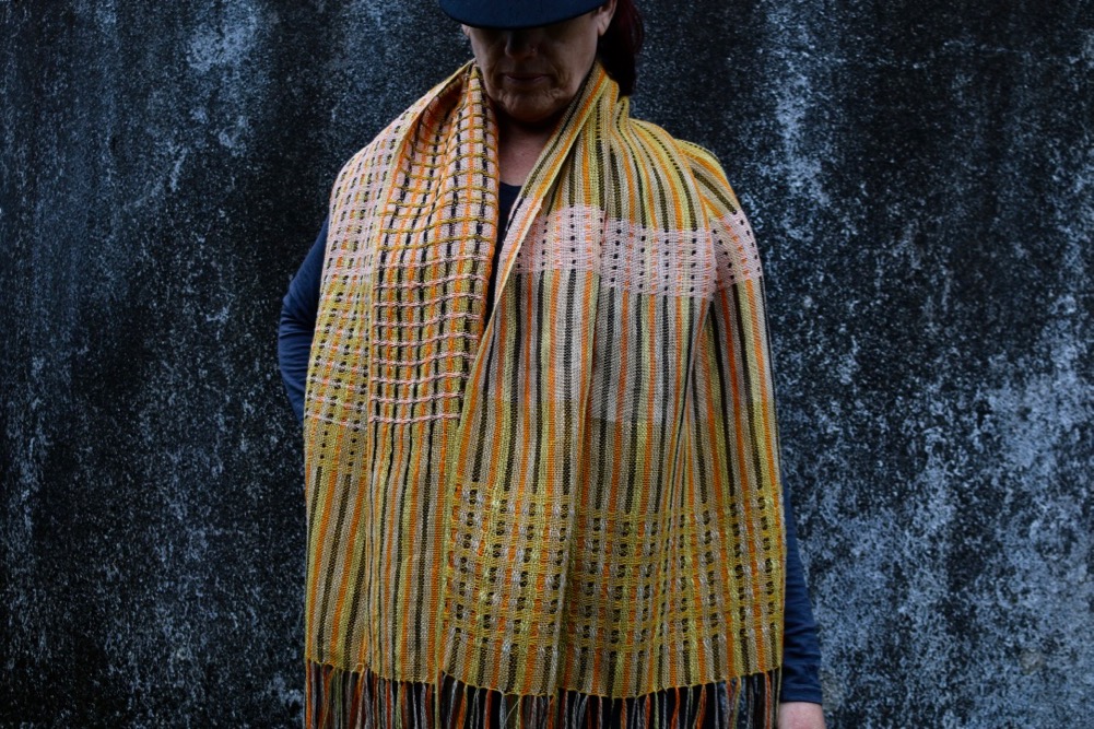 Wrap woven in pure linens and vintage gold silk with a linen cotton warp. It has a double weave structure, both sides are different as there are 2 layers of warp, so a reversible textile. Shades of gold, black and apricot.