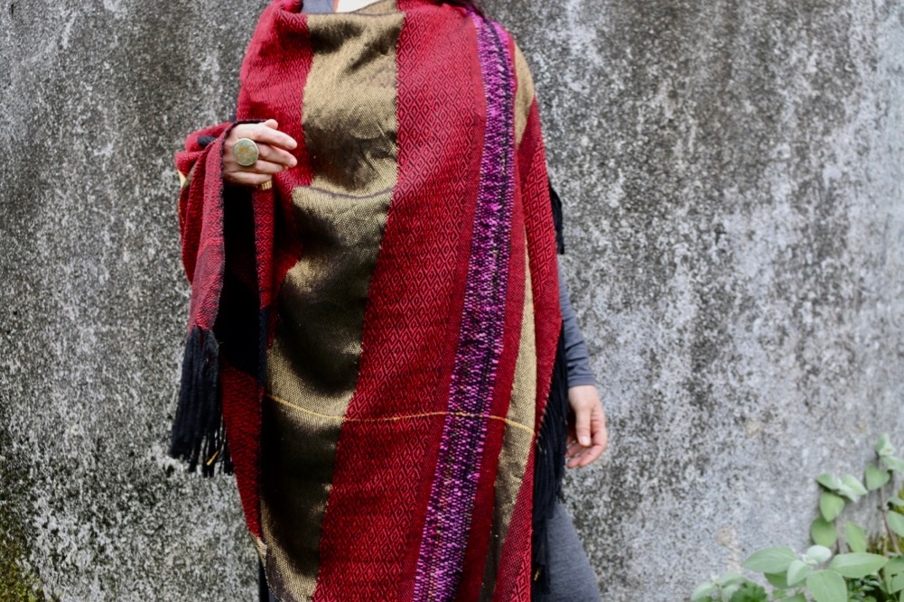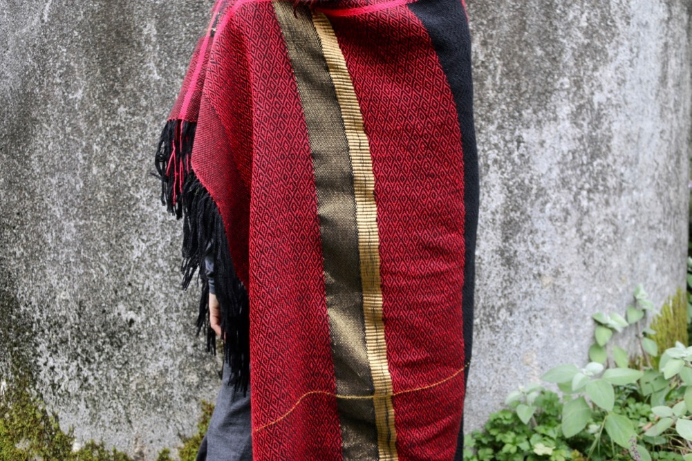 An extra long special shift woven in red and black pure linen, vintage gold silk and recycled fuchsia pink sari silks. The warp is fine black soft merino, birds eye and tabby weaving designs. A stunning textile!