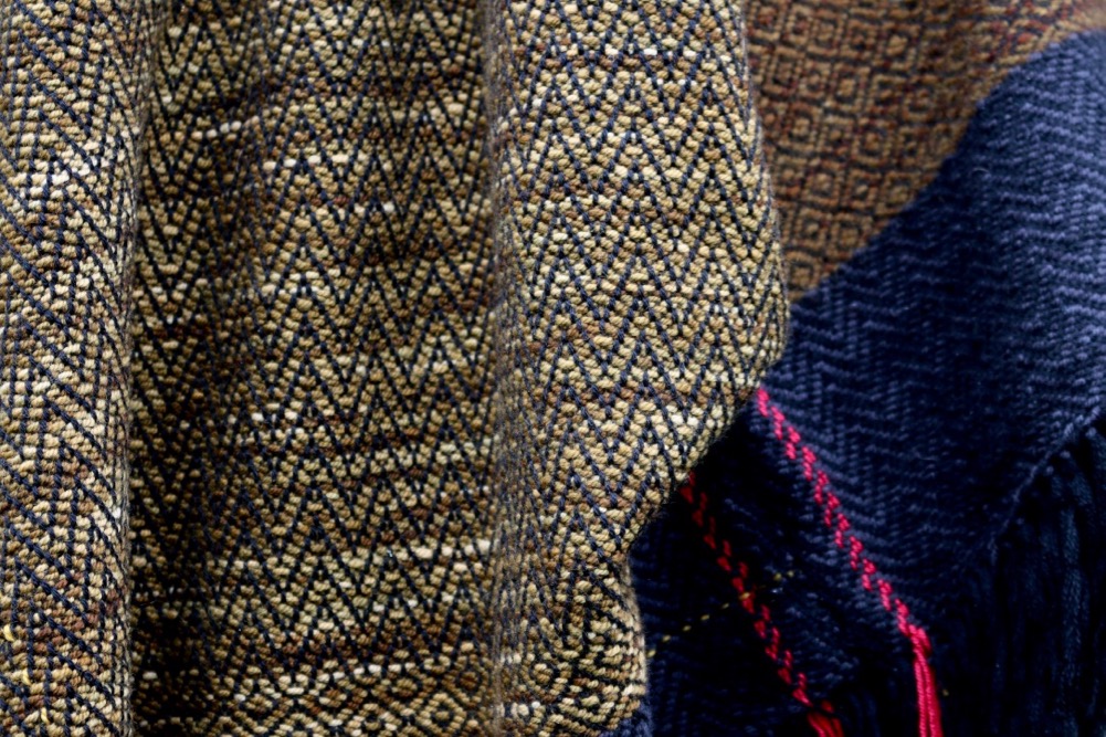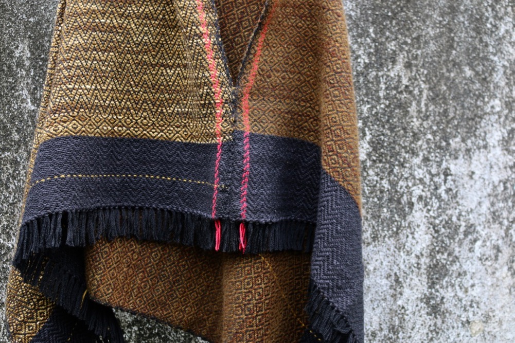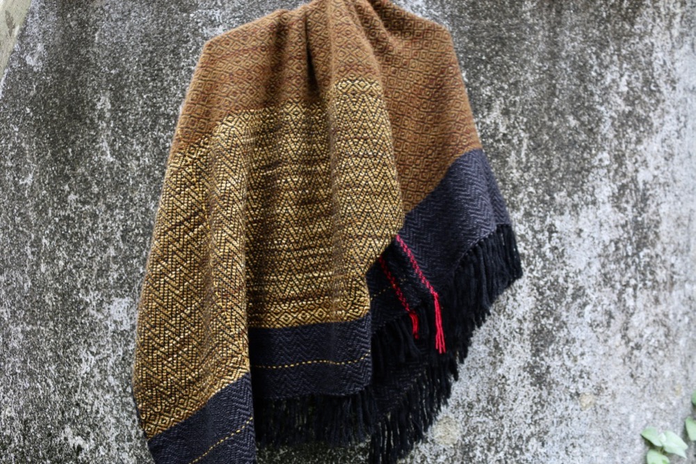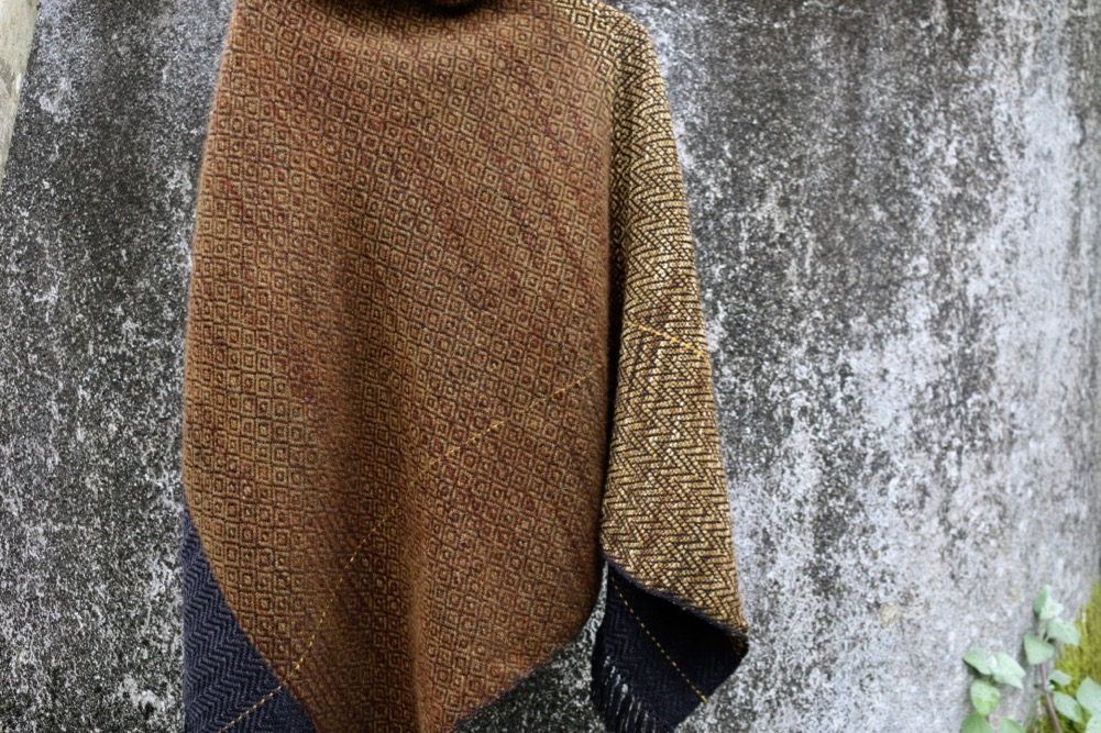 This is a longer shift, woven in silky hand dyed merinos and possum merino in rich brownish khaki shades with a black trim. The warp is fine black merino with a narrow strip of bright red yarns and a single gold thread. Chevron and birds eye weaving designs.